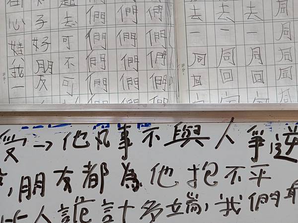 女兒小二時初學寫字的字跡(作業本的字)比現在的(白板上的字)要工整許多。她現在除了持續閱讀中文書外,每星期會默寫幾句成語例句。